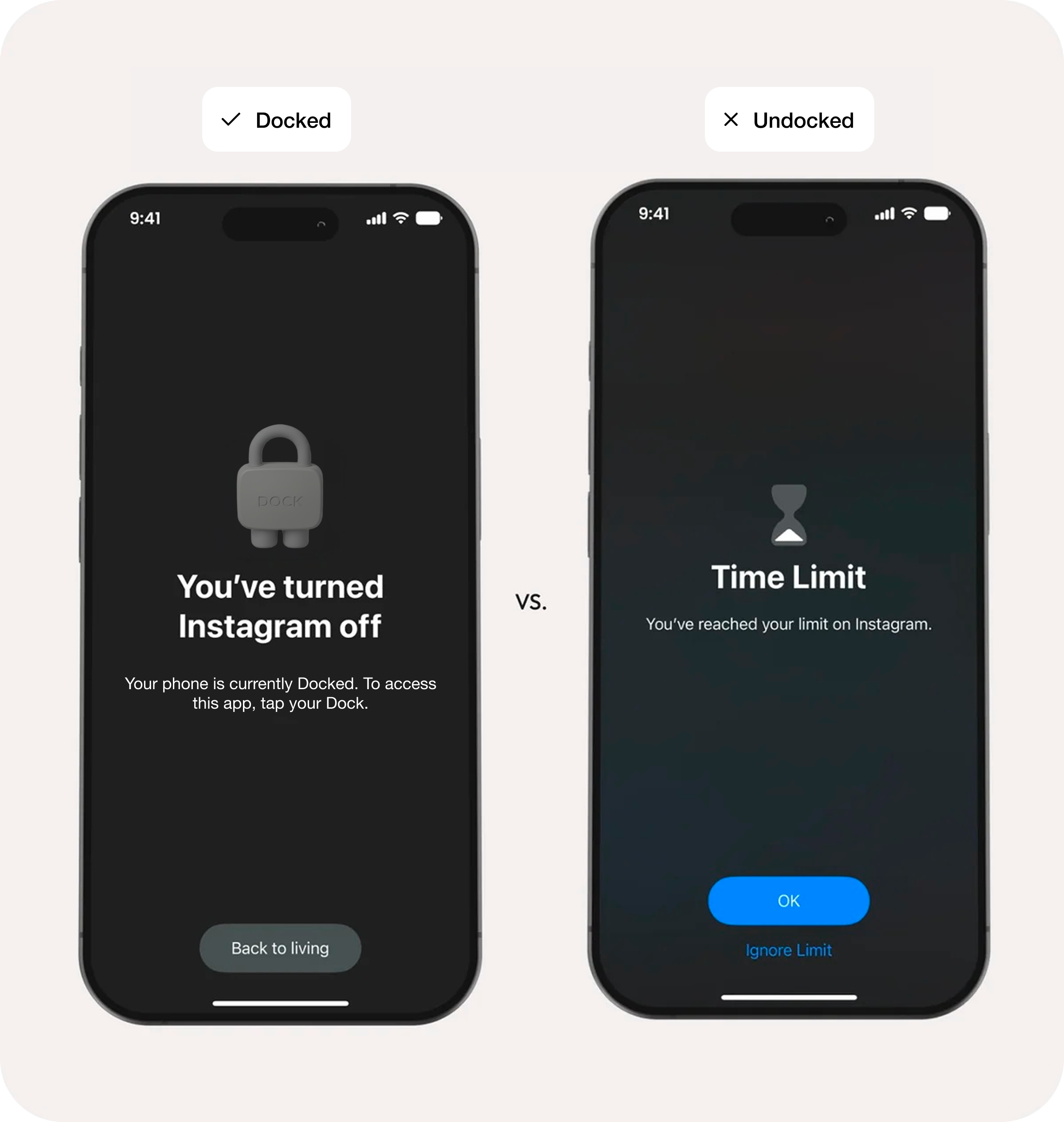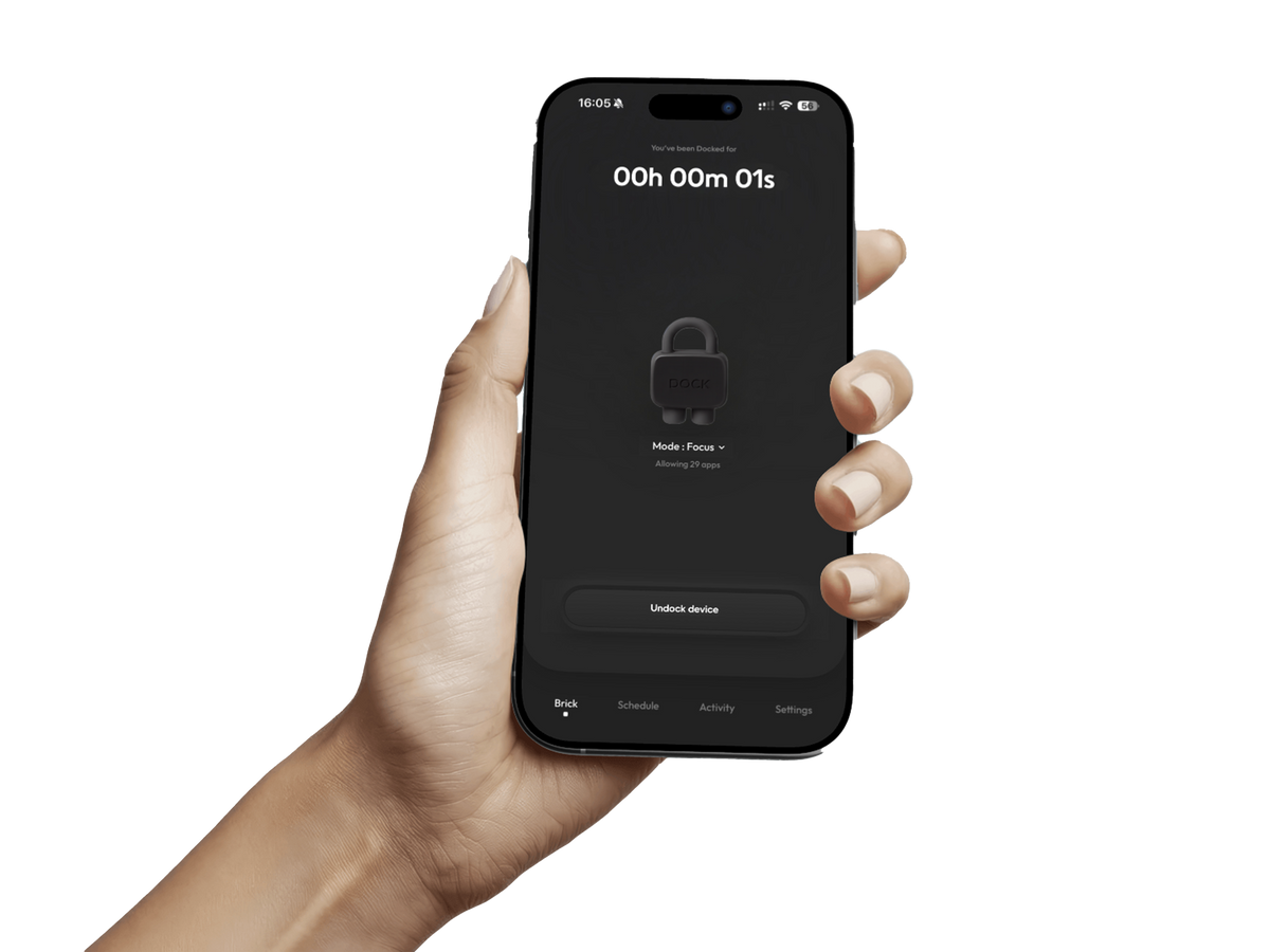 Traditional screen time tools fail because the override is always just a tap away. Dock changes that. By leaving your Dock behind, you create distance between yourself and your distracting apps, keeping them out of reach until you consciously, and physically, choose to unlock them.